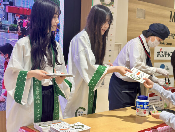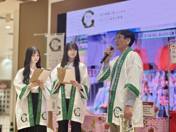 ぎふベジいちご試食会では、ぎふベジメイツ第7期生の杉山 日向花さんと鳥居 優奈さんが生産者の方にお話を伺った後、ぎふベジいちご「美濃娘」の試食を配布。