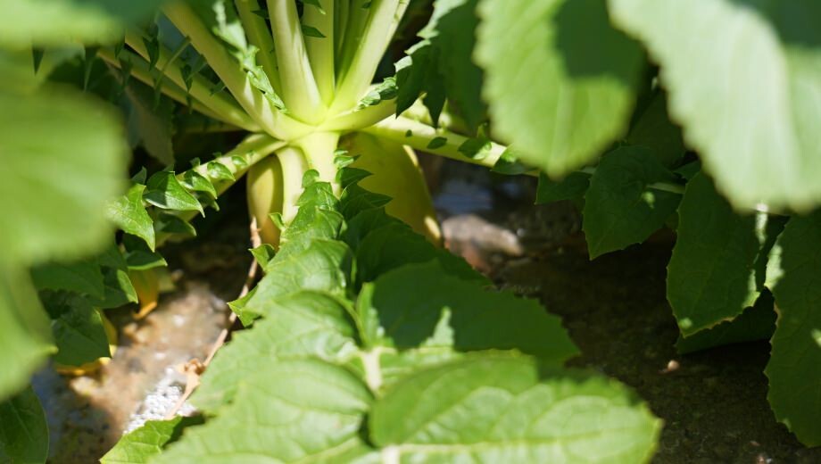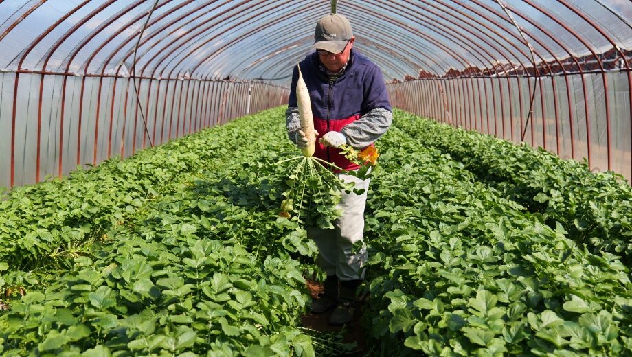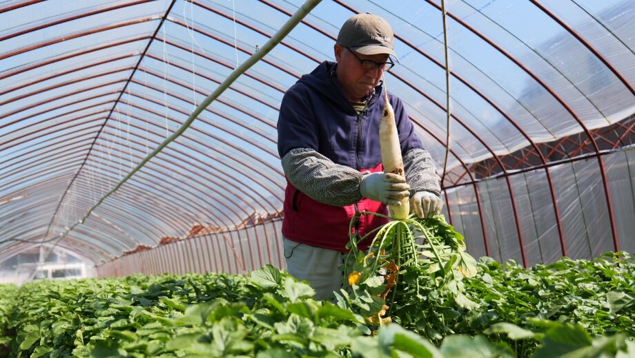 青々と葉を茂らせ、「早く引いて」と言わんばかりに土の中からすっくと伸びる春だいこん。岐阜市則武地区では毎年2月20日頃から春だいこんの出荷が始まり、3月、髙橋秀雄さんのハウスも収穫の最盛期を迎えています。栽培品種は「優等生」。色白で美しい容姿に加えて甘さがあり、みずみずしい食べごたえが特徴です。