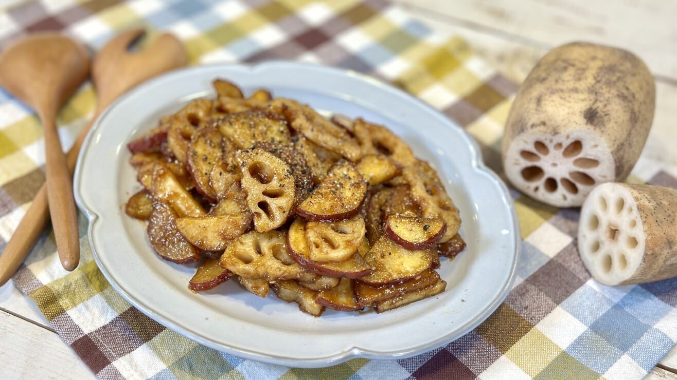 ⑥れんこんは穴が茶色く色づくくらい、さつまいもは表面に焼き色がつくくらいにじっくり焼いたら、③の甘酢ダレをまわしかける。