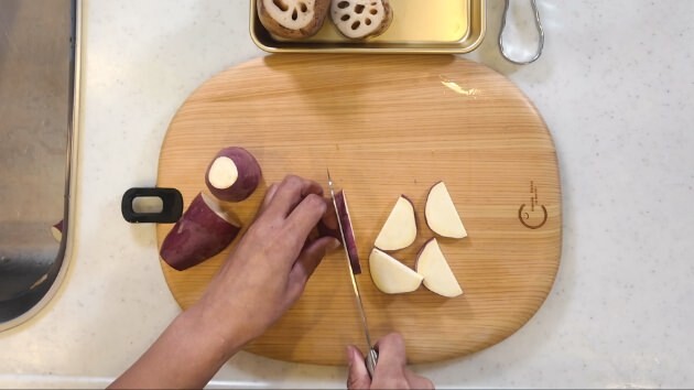 ①さつまいもは皮つきで、5mm幅の半月切りにし、水に5分ほど浸す。