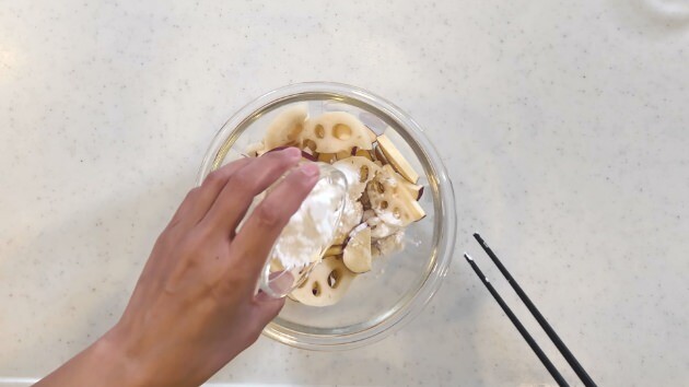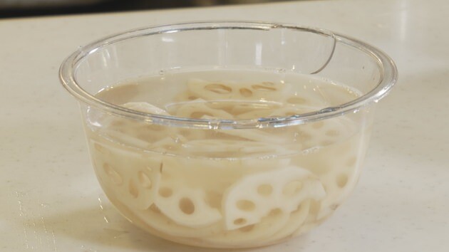 ②れんこんは皮をむき、5mm幅の半月切りにしたら、酢水に浸す。