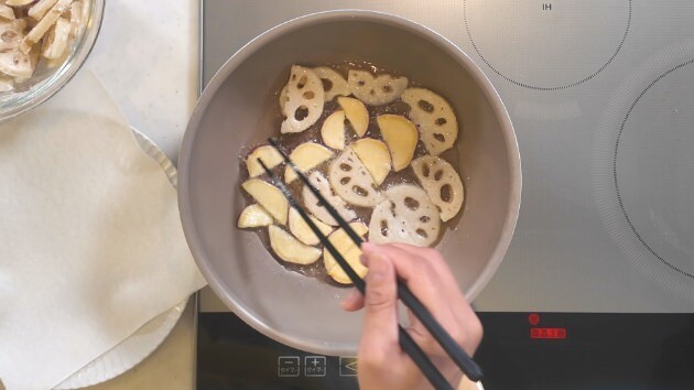 ⑤フライパンに米油を入れて強火よりの中火で熱し、④を揚げ焼きにする。