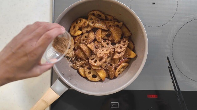 ⑦タレが全体になじんだら、仕上げにすりごまと黒胡椒を振りかけて完成。