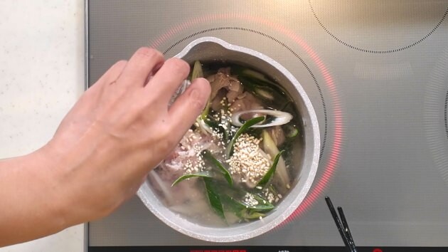 ④鍋にごま油としょうがを加え火を入れ、フツフツとしてきたら豚バラを加える。