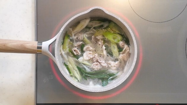 ⑥ねぎと豚バラの油が絡んだら、水・酒・鶏がらスープの素・すりおろしにんにくを加え、沸騰するまで待つ。